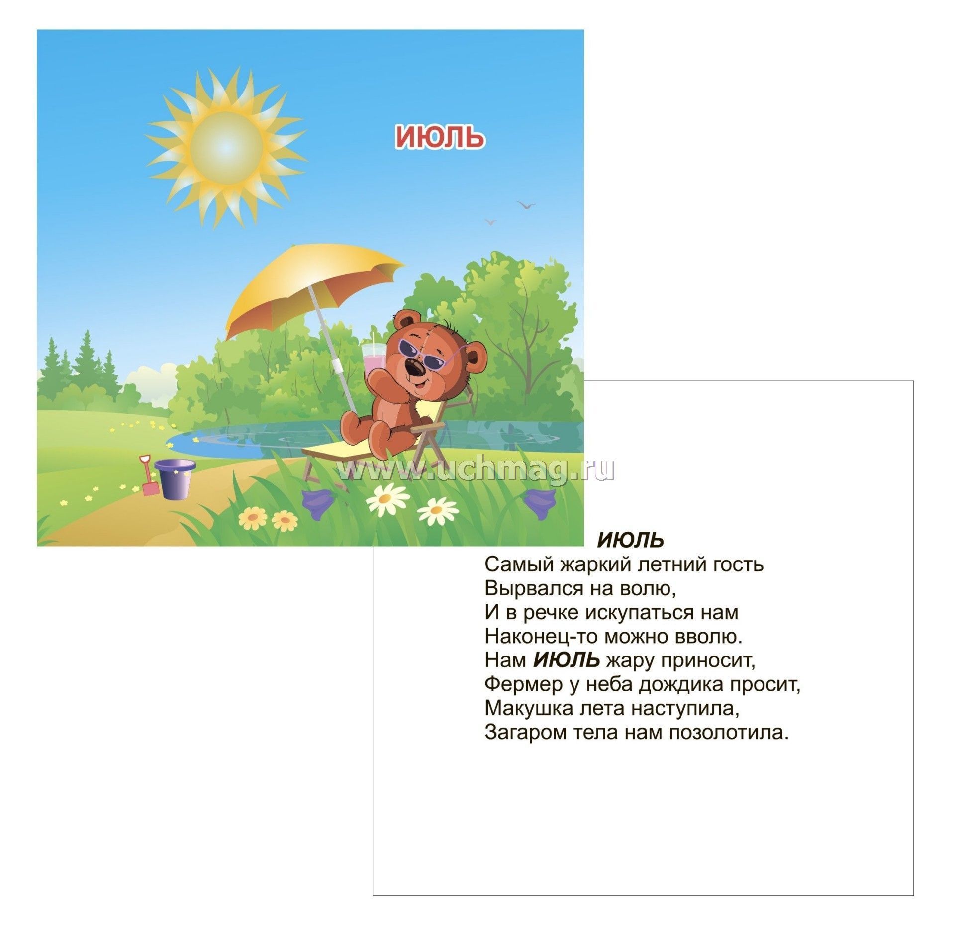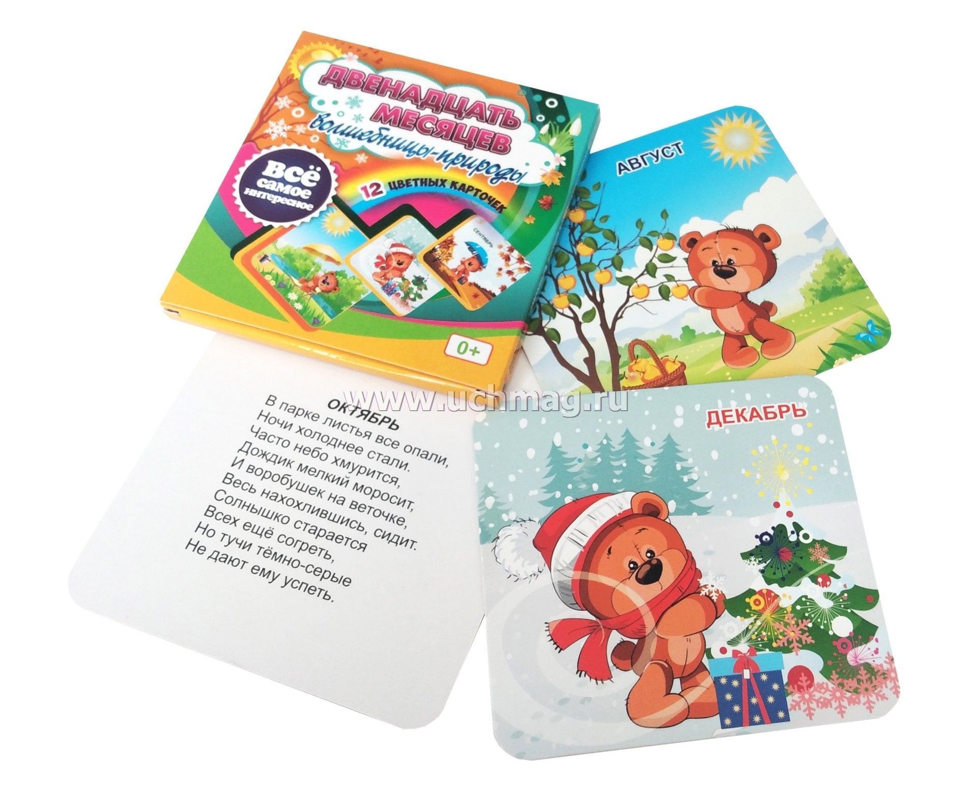 В комплект входит 12 карточек: на лицевой стороне карточки красочное изображение основных примет определенного месяца года, на оборотной - стихотворение.