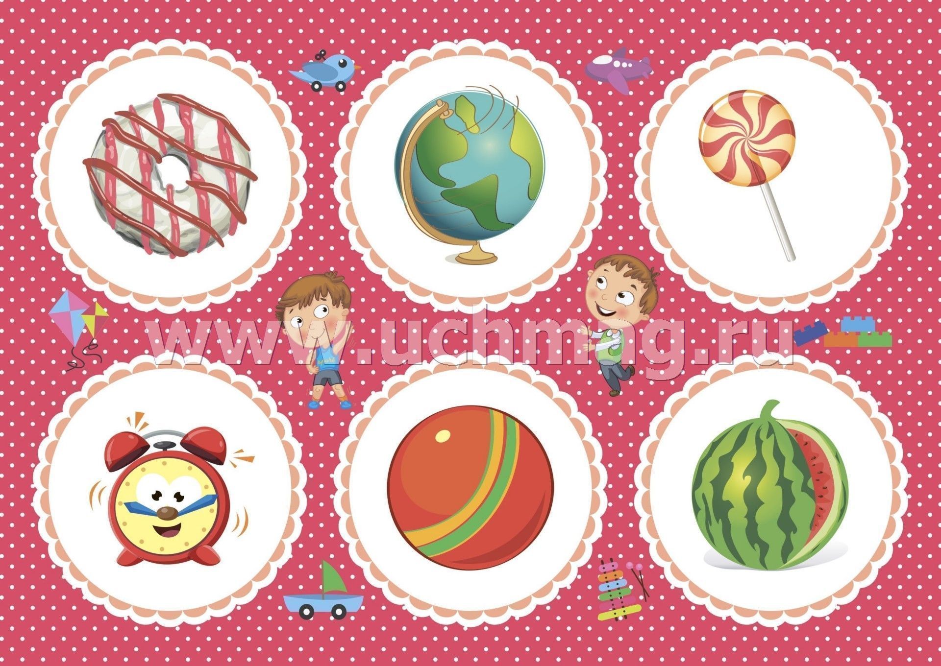 Картинки двухсторонние, с одной стороны геометрические фигуры, с другой - предметы, соответствующие по форме этим фигурам.