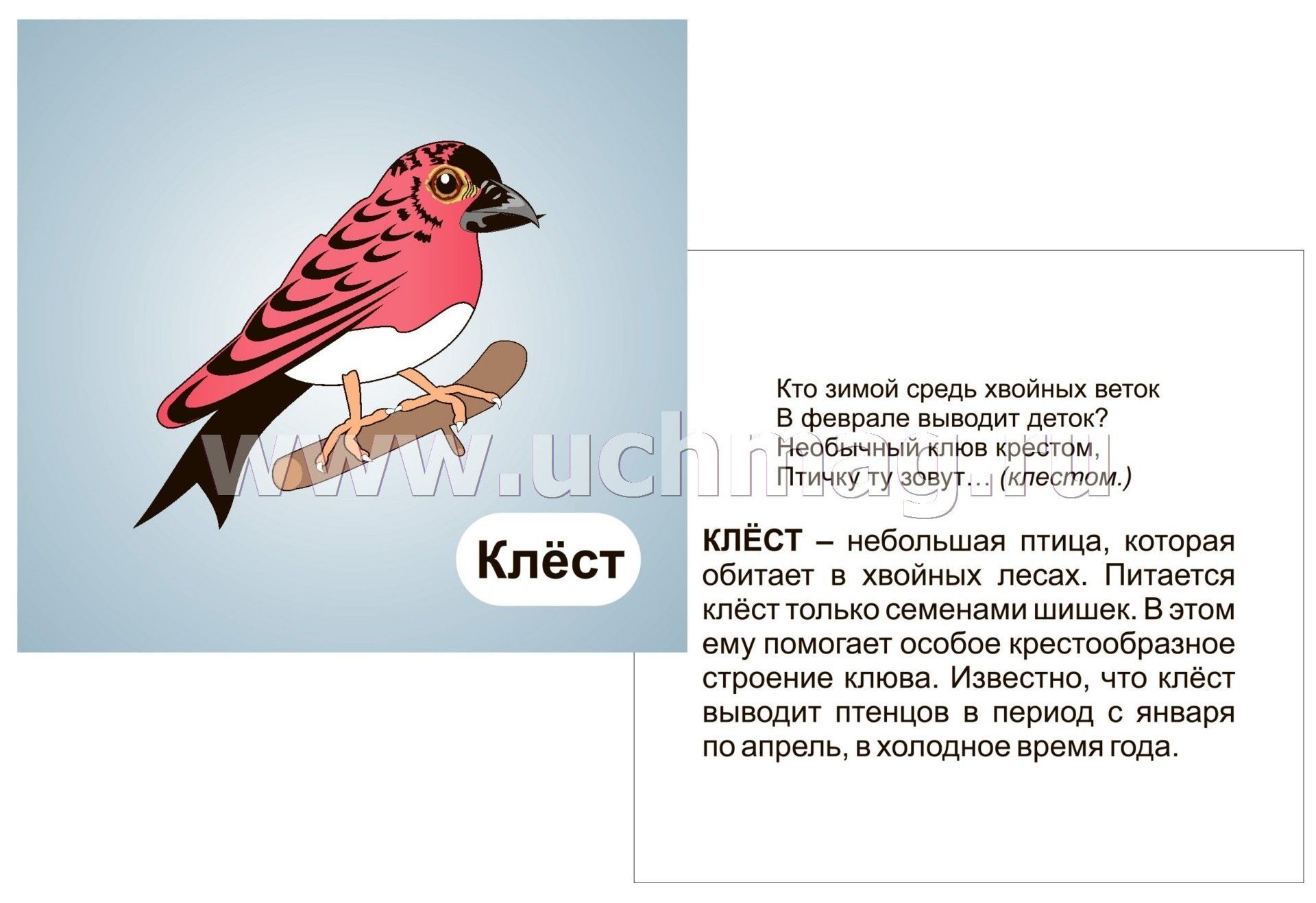 Птицы леса: 12 развивающих карточек с красочными картинками, стихами и загадками для занятий с детьми
