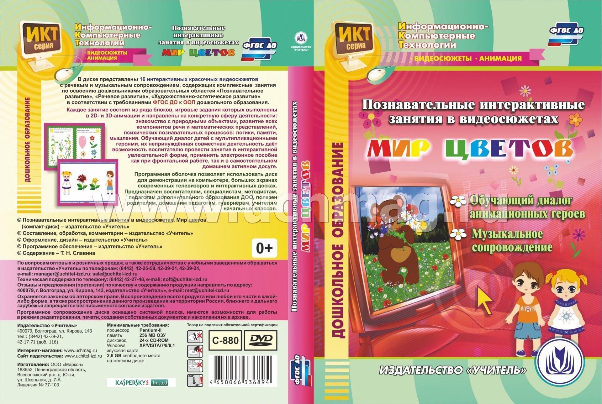 Компакт-диск «Познавательные интерактивные занятия в видеосюжетах. Мир цветов» серии «Информационно-компьютерные технологии» представляет 16 интерактивных красочных видеосюжетов с речевым и музыкальным сопровождением, содержащих комплексные занятия по освоению дошкольниками образовательных областей «Познавательное развитие», «Речевое развитие», «Художественно-эстетическое развитие» в соответствии с требованиями ФГОС ДО к ООП дошкольного образования.