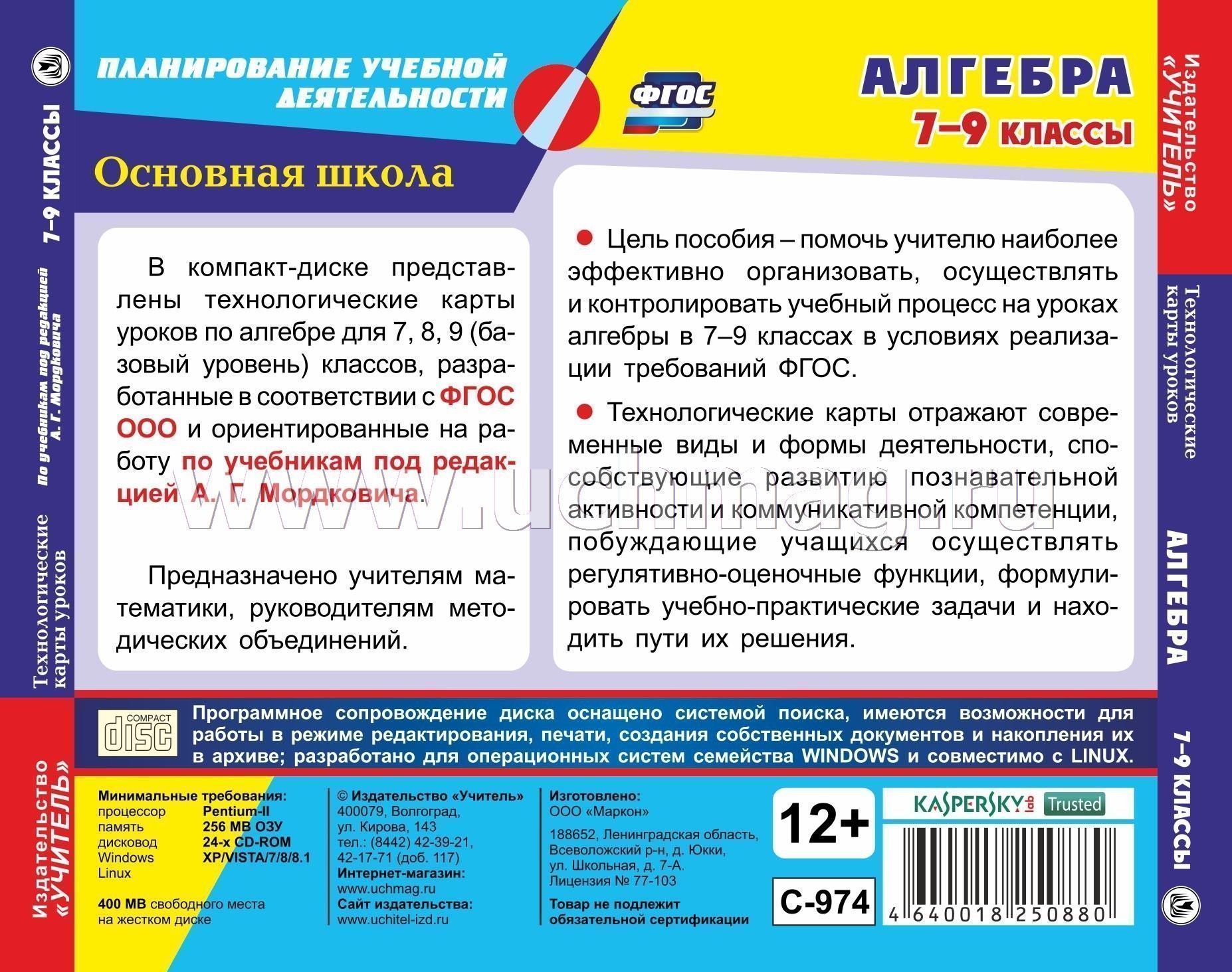 Настоящее электронное пособие «Алгебра. 7–9 классы. Технологические карты уроков по учебникам А. Г. Мордковича» серии «ФГОС. Планирование учебной деятельности» создано в помощь учителям математики, руководителям методических объединений. В компакт-диске представлены технологические карты уроков по математике для 7, 8, 9 классов, разработанные в соответствии с ФГОС ООО и ориентированные на работу по учебникам и задачникам А. Г. Мордковича, Л. А. Александровой, Т. Н. Мишустиной, Е. Е. Тульчинской.