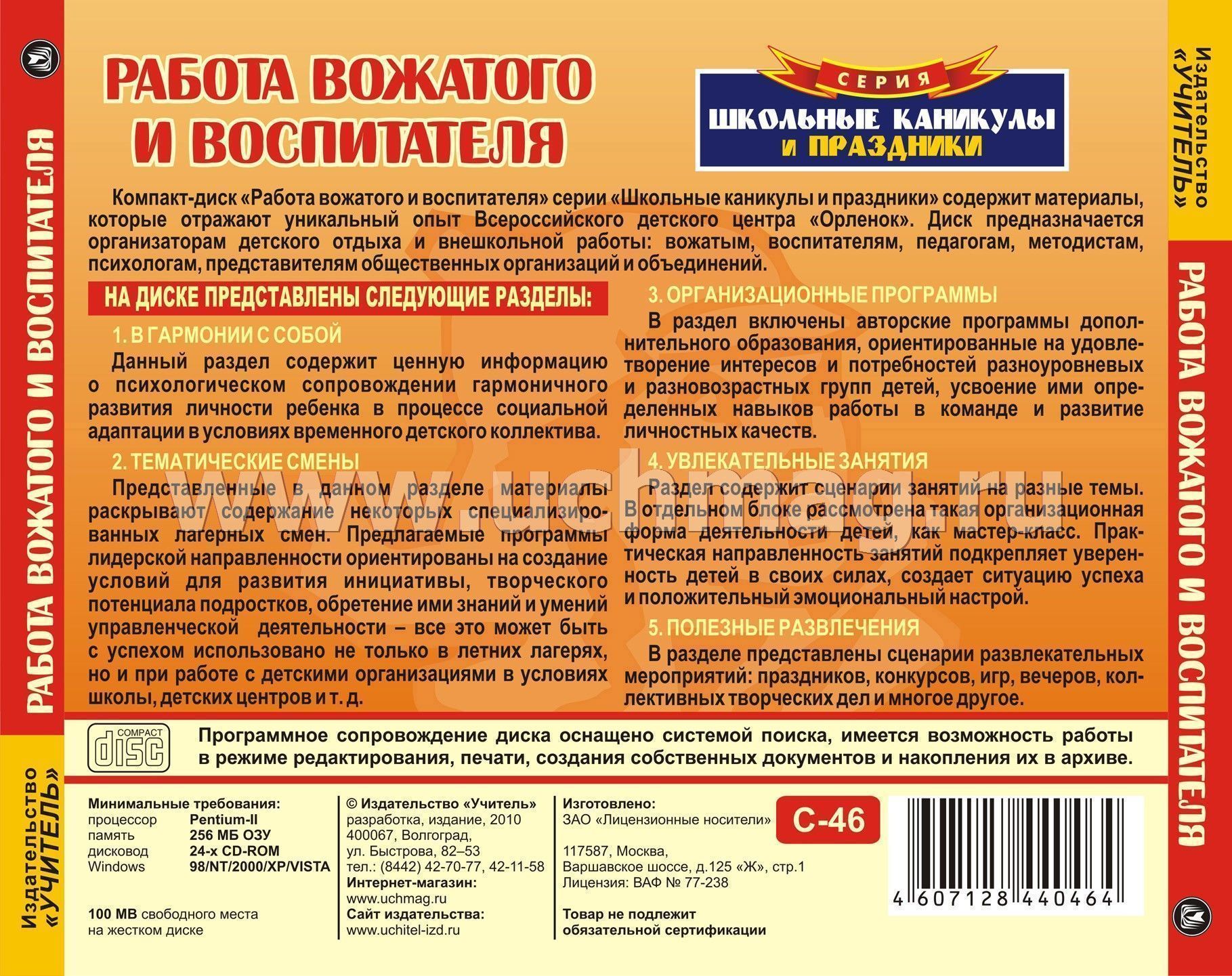 Электронное пособие "Работа вожатого и воспитателя" серии "Школьные каникулы и праздники" содержит материалы, которые отражают уникальный опыт Всероссийского детского центра "Орленок". Диск предназначается организаторам детского отдыха и внешкольной работы: вожатым, воспитателям, педагогам, методистам, психологам, представителям общественных организаций и объединений.