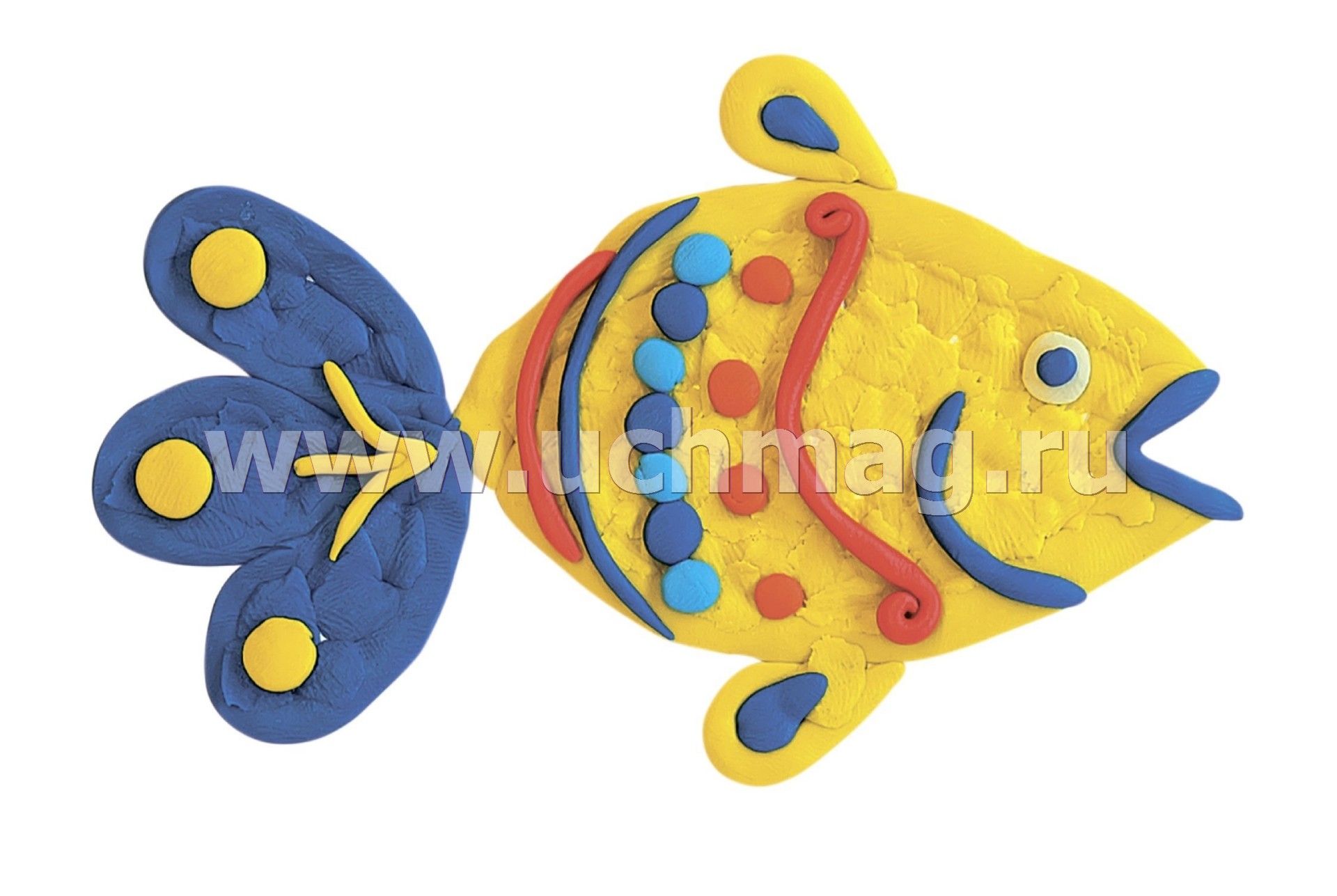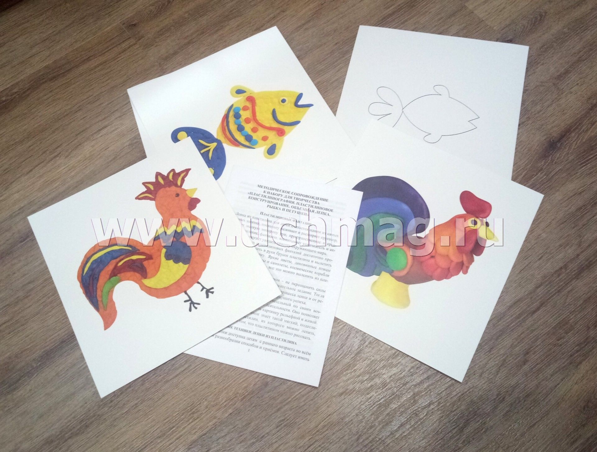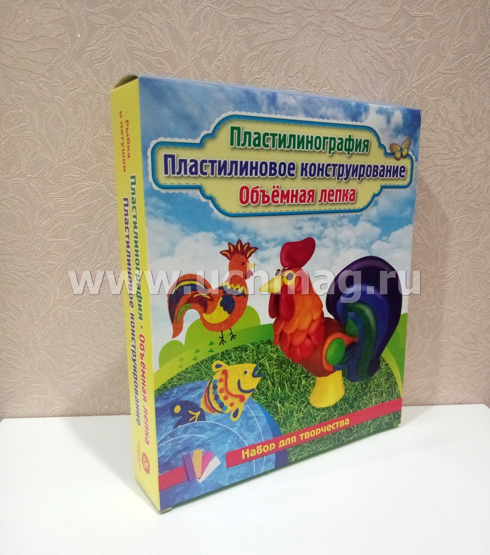Пластилинография. Пластилиновое конструирование. Объёмная лепка. Рыбка и петушок: набор в коробочке содержит 3 цветных карточки, 2 карточки-трафарета, брошюру, 1 стек и 12 брусков пластилина
