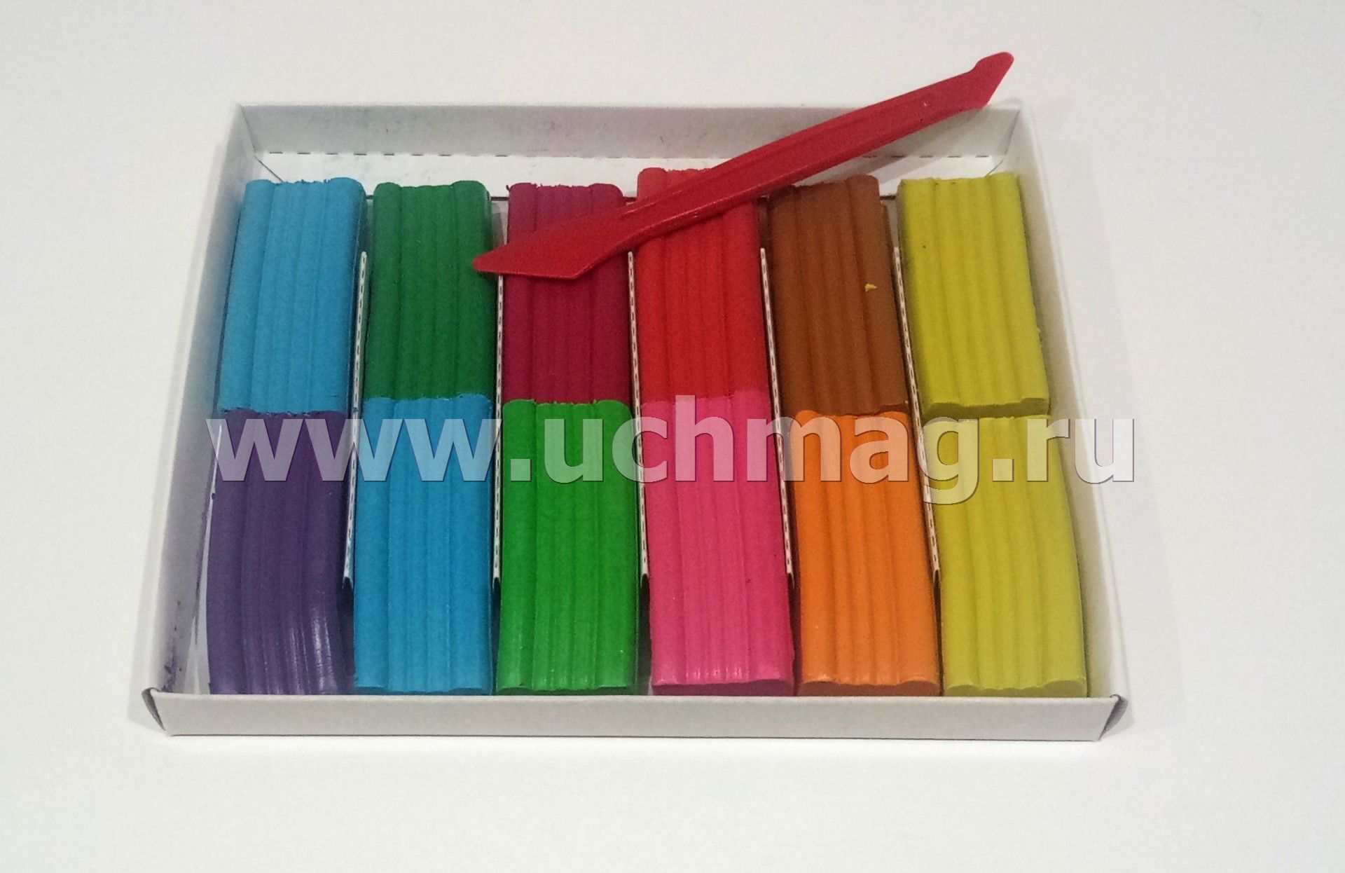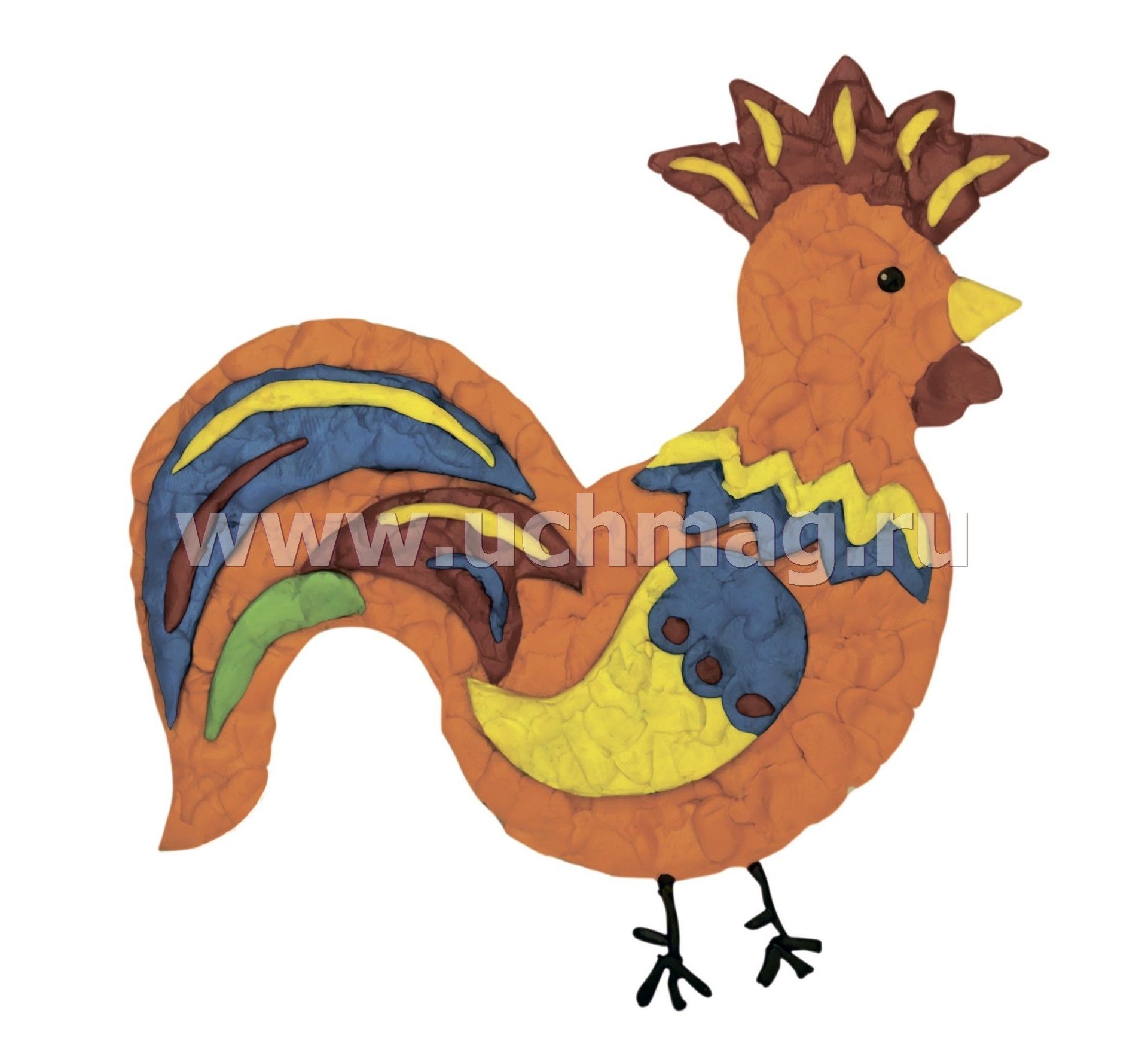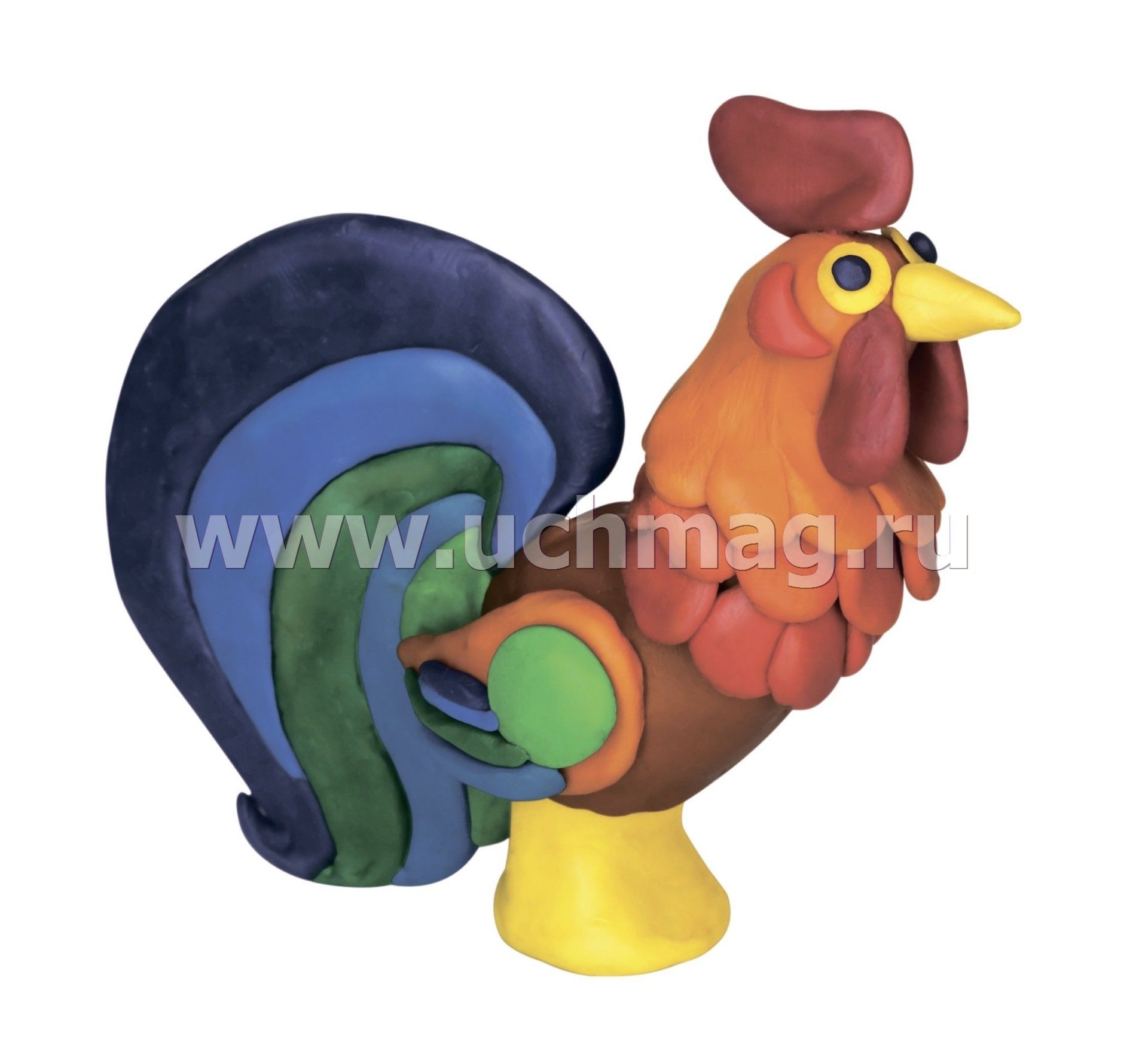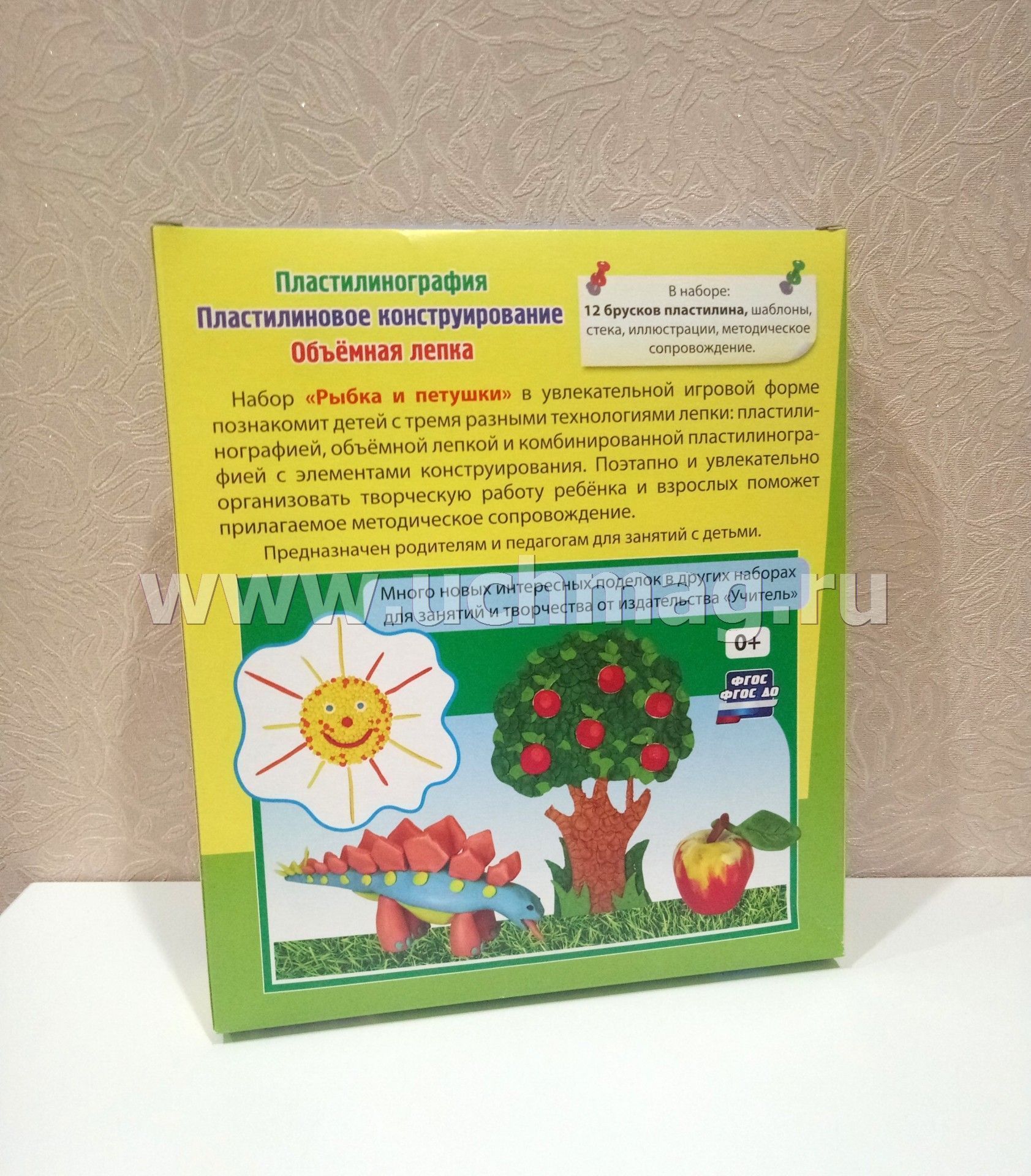 Пластилинография. Пластилиновое конструирование. Объёмная лепка. Рыбка и петушок: набор в коробочке содержит 3 цветных карточки, 2 карточки-трафарета, брошюру, 1 стек и 12 брусков пластилина